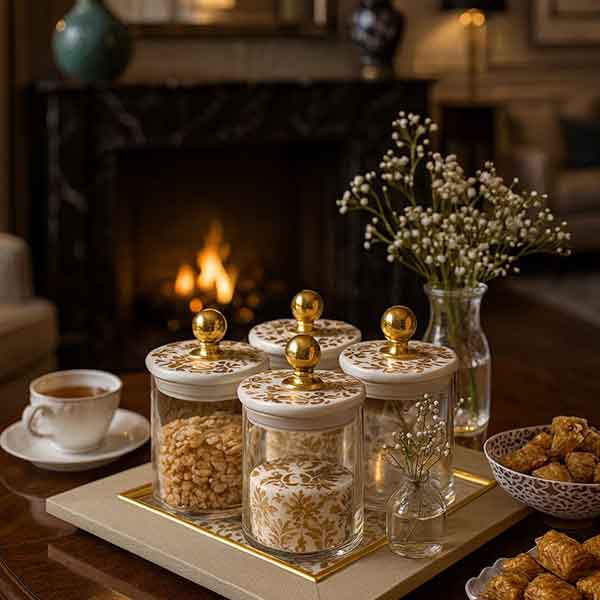 Introduce timeless elegance to your decor with the 4 empress Jars with Ivory frame tray by Magnolia Home. This exquisite set features intricately designed jars paired with a beautifully crafted ivory frame tray, exuding baroque-inspired sophistication. Perfect for storing essentials or adding a decorative touch, it combines luxury and functionality, making it a stunning centerpiece for any space.