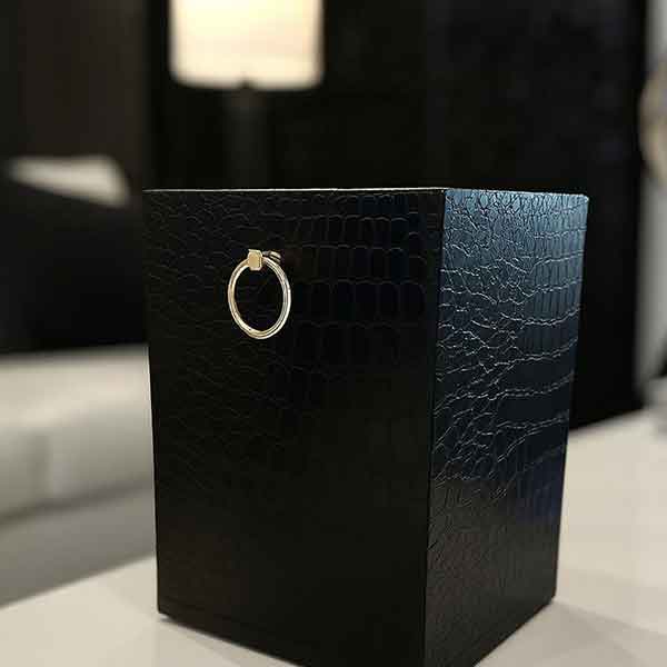 Keep your space chic and clutter-free with our Black Crocodile Leatherrite Dustbin, designed with sleek round knobs for a modern touch. A perfect blend of style and functionality for any room.