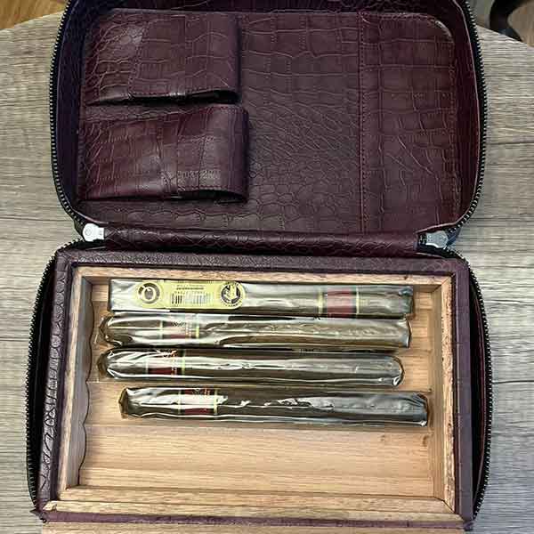 Indulge in sophistication with the Luxury Cigar Cover in Maroon Crocodile Leather with Accessory Pockets by Magnolia Home. Crafted from premium mahogany wood and genuine leather, this sleek cover features dedicated pockets for your cigar accessories and a secure zip closure to keep everything perfectly organized. Ideal for travel or gifting, it combines elegant design with practical functionality, making it an essential for any discerning cigar enthusiast.