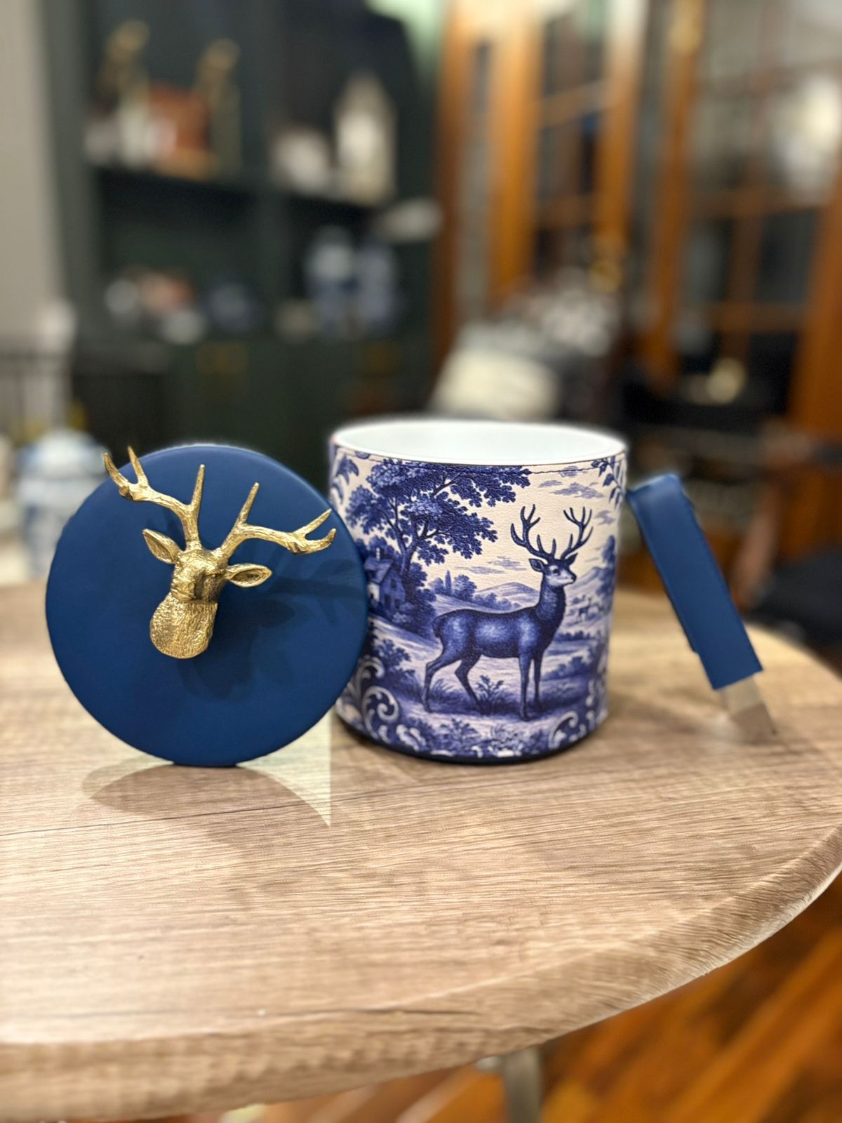 Add a touch of luxury with our blue stag design printed leather ice bucket, finished with an elegant stag knob. A perfect blend of style and function for your bar or entertaining space.