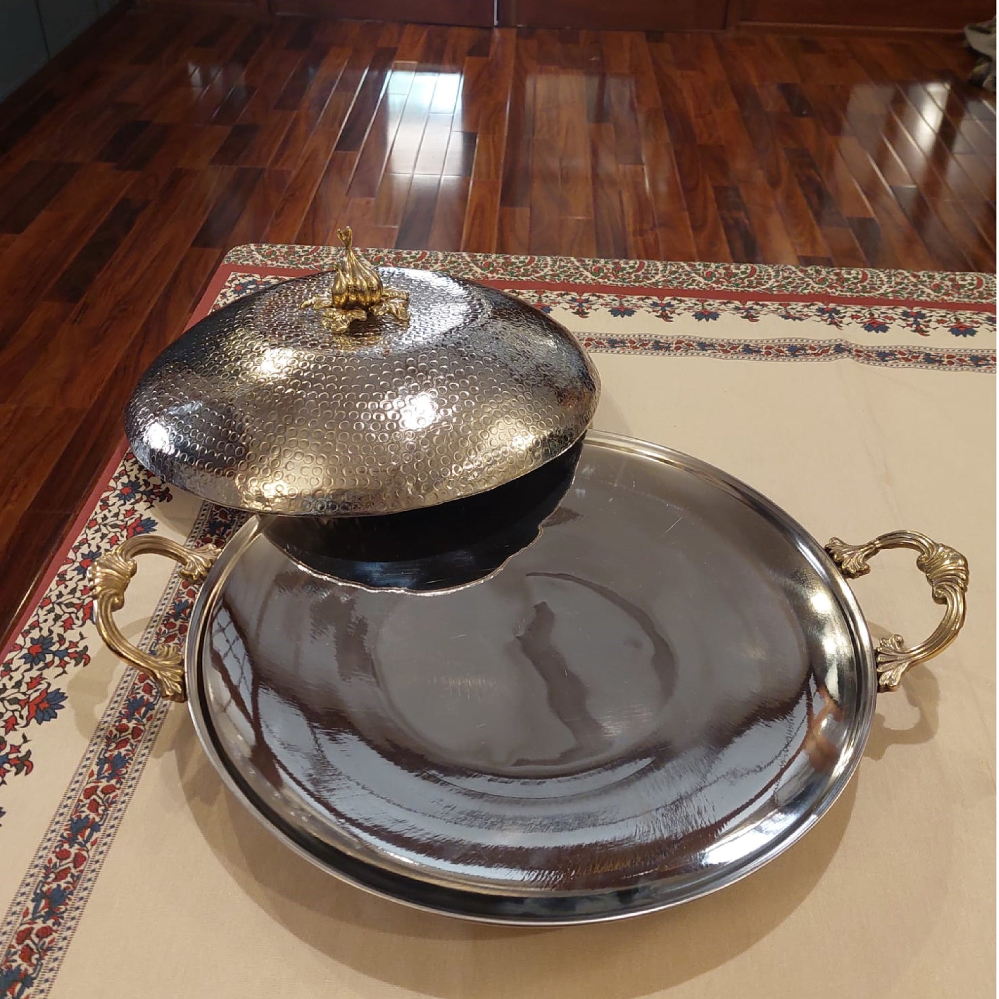 Enhance your dining table with this handcrafted brass garlic lidded dish, featuring a sleek silver lacquered finish. Perfect for serving with elegance and style