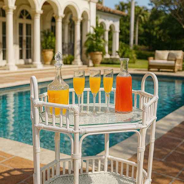 Serve in style with our handmade two-tier rattan cart, available in black, white, or natural rattan lacquered finishes, featuring elegant brass gold tires. Perfect for adding luxury to any occasion.