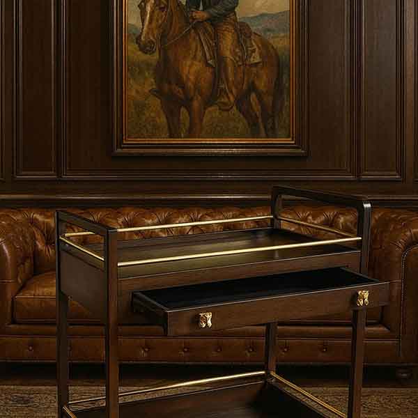 Enhance your space with our handmade beech wood cart, accented by brass rods and available in dark polished wood. Perfect for versatile and stylish serving. Dimensions are: 29.5 L x 30H x 18.5W