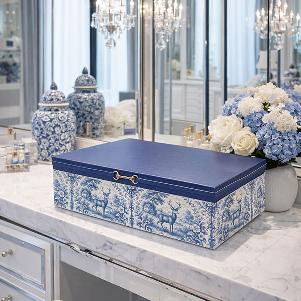 An elegant vanity chest designed for refined dressing spaces, perfect for storing jewelry and precious keepsakes. Crafted from wood and wrapped in printed faux leather, it features a mirror inside the lid and a thoughtfully designed jewelry tray, with a hidden compartment beneath for discreet storage. A timeless piece that blends classic charm with practical luxury.Measurements: L20 x W15 x H5