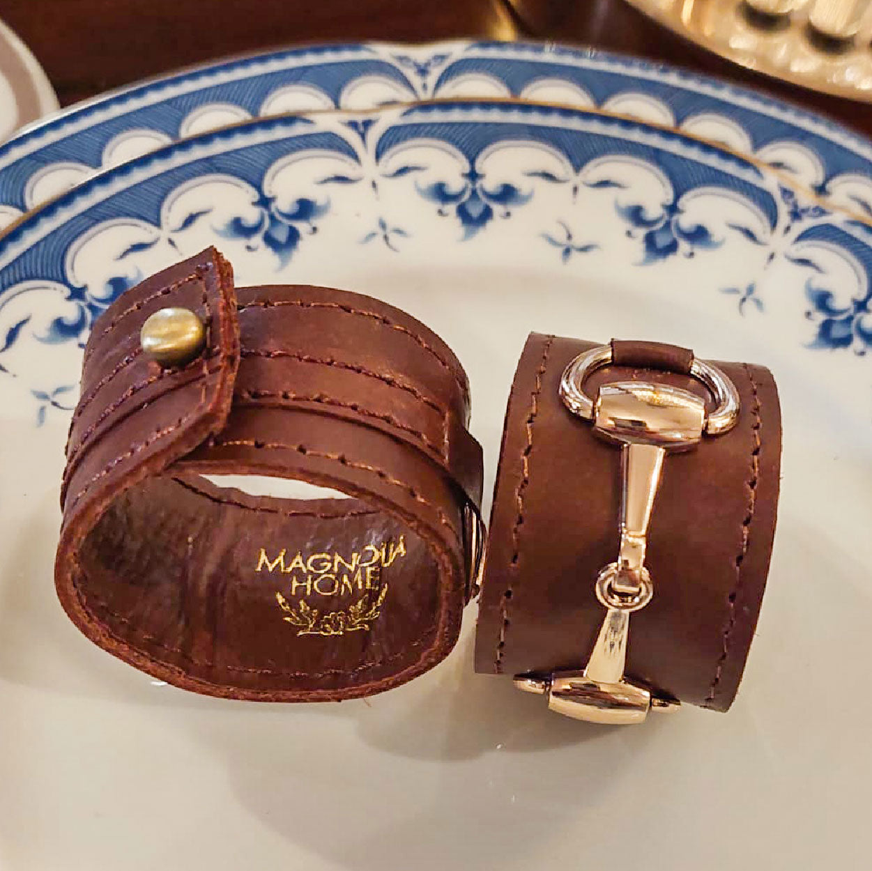 Elevate your dining experience with the Leather Horse-Bit Napkin Rings by Magnolia Home. Crafted from premium leather and adorned with elegant horse-bit accents, these napkin rings bring a touch of equestrian sophistication to your table. Perfect for both casual gatherings and formal occasions, they combine timeless style with impeccable craftsmanship, adding a refined finish to any tablescape. |