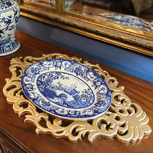 Elevate your entertaining with the Wedgewood Platter on Carved Gold Wooden Frame by Magnolia Home. This stunning piece combines the timeless beauty of fine Wedgewood craftsmanship with the opulence of a hand-carved gold wooden frame. Perfect as a centerpiece or serving platter, it adds a touch of elegance and sophistication to any gathering or display.